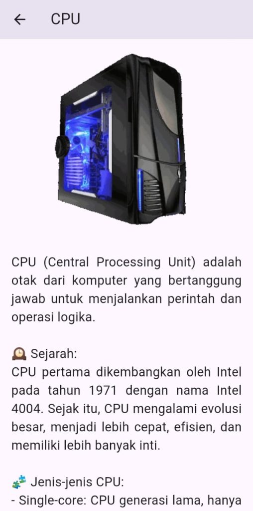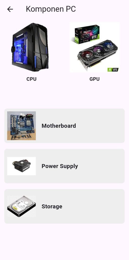 Aplikasi dirancang dengan tampilan intuitif agar belajar komponen PC menjadi lebih mudah dan menyenangkan.